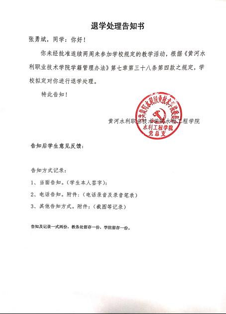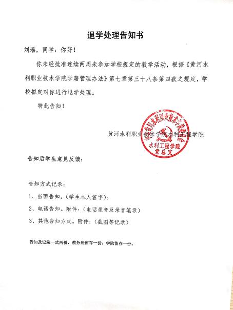 关于张勇斌、刘瑶同学自动退学处理告知书的公告