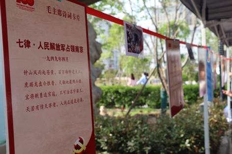 本次活动以党史知识竞赛和学习伟人诗词相结合的方式举办。毛主席诗词是他世界观、人生观、价值观的高度浓缩和艺术载体。从“问苍茫大地,谁主沉浮”到“天翻地覆慨而慷”,从上下求索到彻底改变中国命运。将毛主席的诗词做成卡片悬挂在活动会场四周,营造了浓厚的历史氛围。