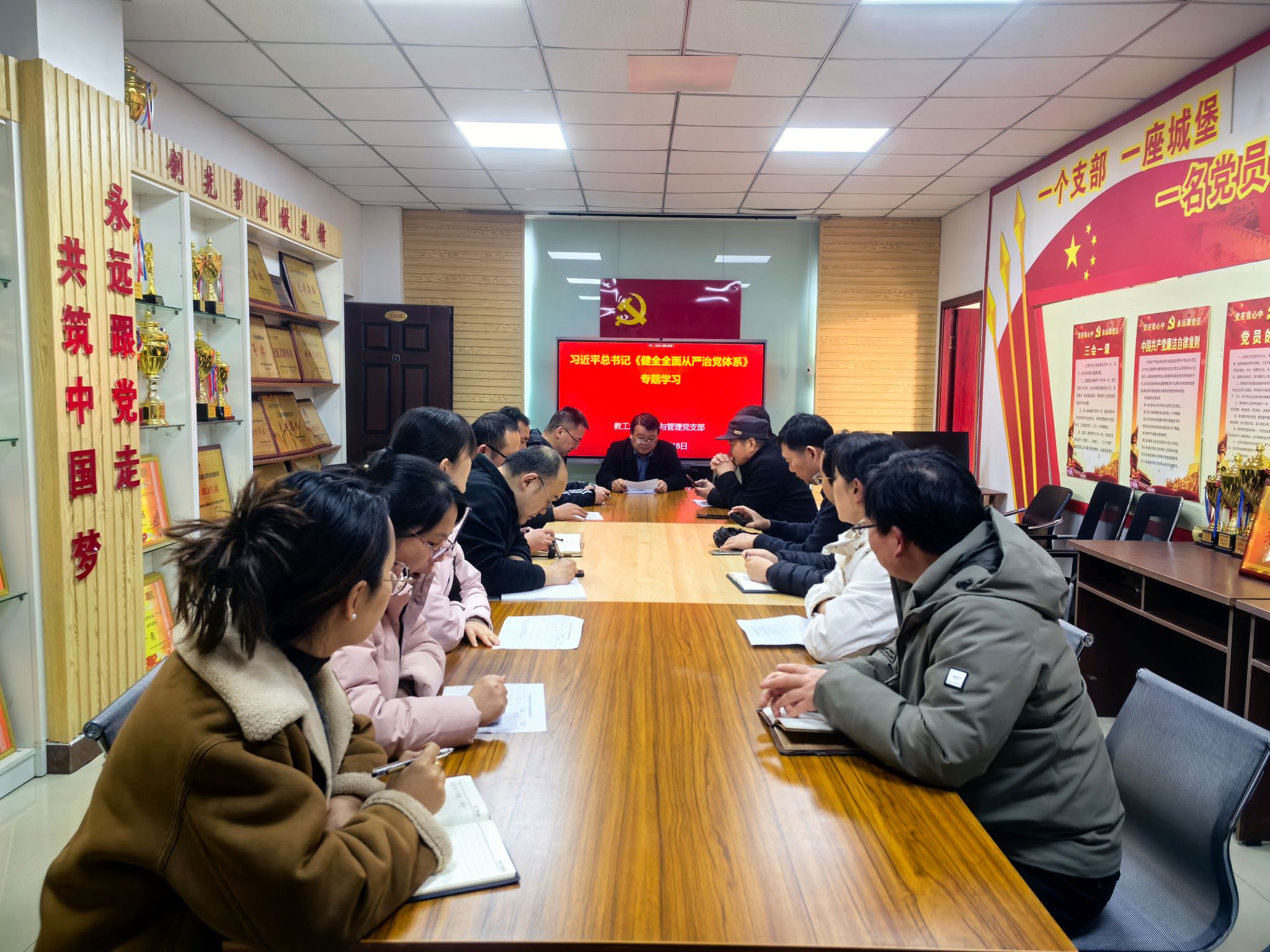 218日,教工水工技术与管理党支部全体党员在实训楼5306专题学习习近平总书记重要文章《健全全面从严治党体系》,支部全体党员参加了本次学习。