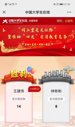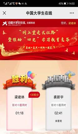 本次党史知识竞赛以“中国大学生在线答题系统”为依托,在“网上重走长征路”栏目开展“四史”学习教育竞答,答题包括英雄篇、复兴篇、创新篇、信念篇、限时赛、抢十赛等类型。活动开始后,支部党员迅速进入竞答状态,现场气氛十分激烈。经过几轮的激烈角逐,支部党员多次击败系统随机分配的浙江高校对手,获得勋章、积分等奖励。