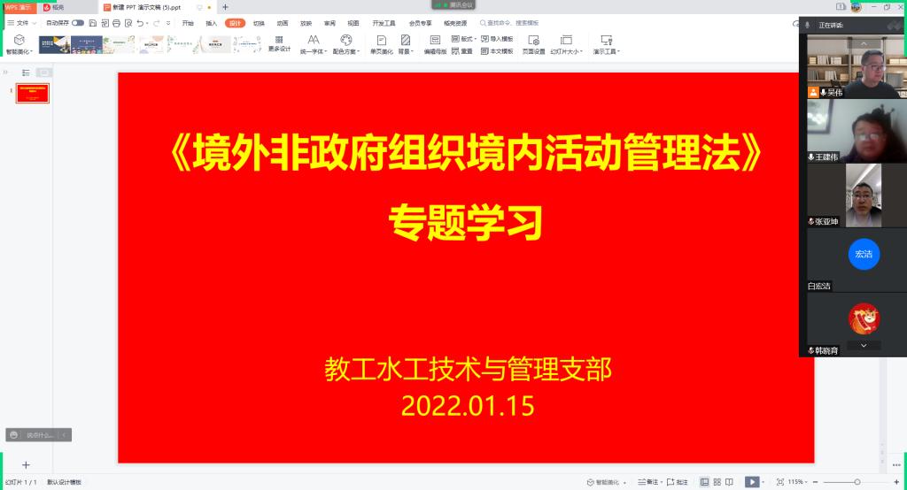 为进一步加强普法宣传,增强党员教师法律意识,强化安全防范能力,1月15日晚上,水利工程学院党总支教工水工技术与管理支部全体党员通过线上会议的形式开展了《中华人民共和国境外非政府组织境内活动管理法》普法宣传活动,本次学习活动由党支部副书记吴伟同志主持。