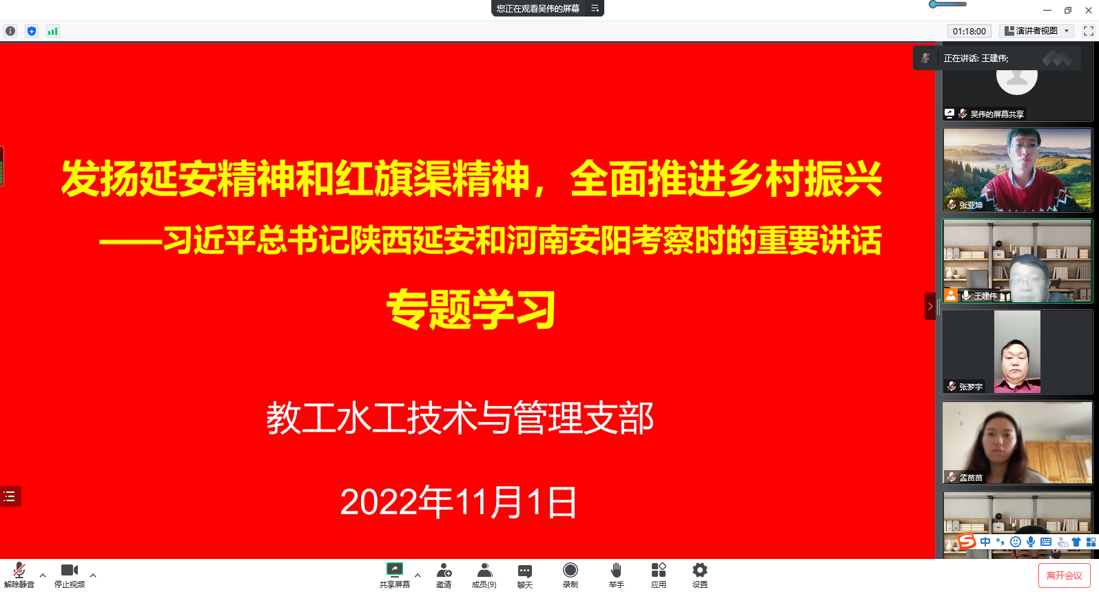 111日下午,教工水工技术与管理支部通过腾讯会议开展“习近平总书记在陕西延安和河南安阳考察时的重要讲话”专题学习活动,专题学习由支部书记王建伟同志主持,支部全体党员参加了本次学习。