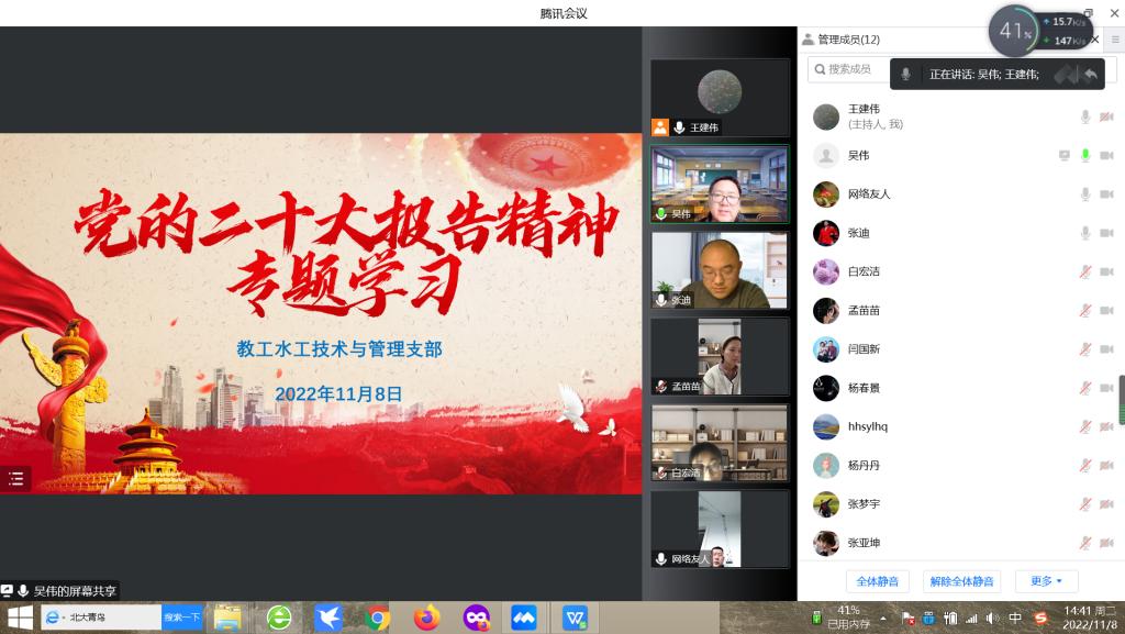 11月8日,教工水工技术与管理支部组织全体党员通过腾讯会议集中专题学习党的二十大报告精神。本次是支部第二次学习党的二十大报告,由王建伟同志主持,支部全体成员参加了学习。