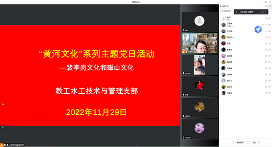 弘扬黄河精神,牢记初心使命。11月25日下午,水利工程学院党总支教工水工技术与管理党支部全体党员通过腾讯会议召开了“黄河文化”系列之“裴李岗文化和磁山文化”主题党日活动,活动由支部书记王建伟同志主持,全体党员教师参加了本次学习活动。