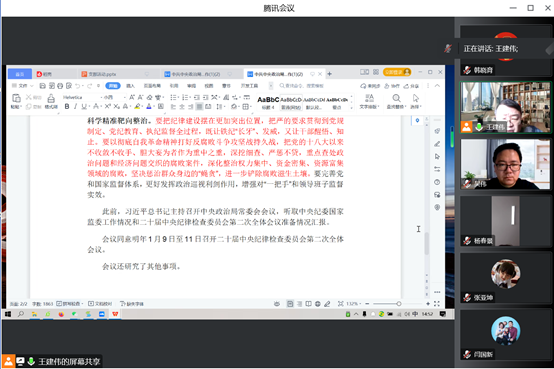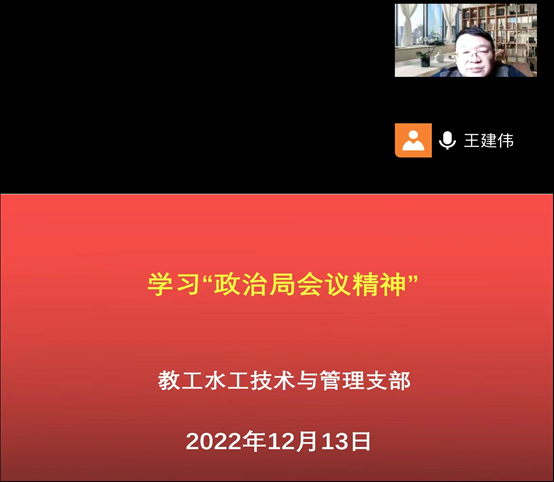 12月13日下午,教工水工技术与管理支部全体党员通过腾讯会议学习12月6日中共中央政治局会议精神,该会议由支部书记王建伟主持。