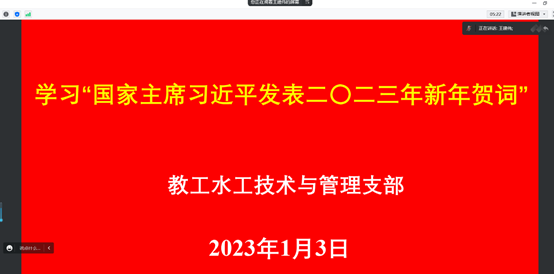 1月3日下午,水利工程学院党总支教工水工技术与管理党支部全体党员,通过腾讯会议对习近平主席发表的2023年新年贺词开展了专题学习,学习由支部书记王建伟同志主持,支部全体党员参加了本次学习。