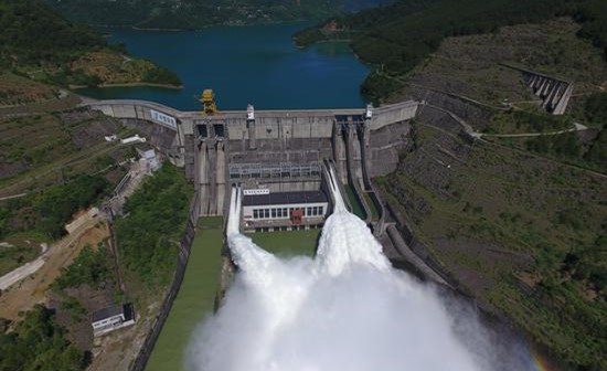混凝土重力坝坝顶高程595m,全长524.5m。泄水建筑物布置在厂房坝段两侧。左侧有2个表孔和2个底孔,右侧有2个中孔和2个底孔。表孔弧门尺寸15m×17.3m,堰顶高程571m。中孔弧门孔口尺寸13m×15m,进口底坎高程560m。底孔弧门孔口尺寸4m×8m,右侧孔进口底坎高程510m,左侧孔进口底坎高程530m。表孔仅在超过千年一遇洪水时启用。各泄水建筑物均采用挑流消能方式。