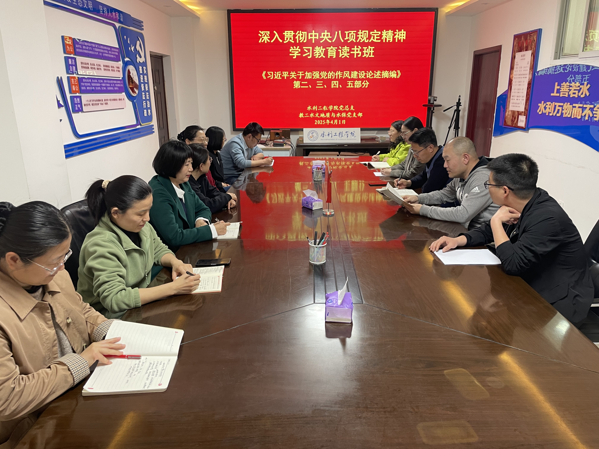 为深入学习习近平新时代中国特色社会主义思想,贯彻执行《中共中央办公厅关于在全党开展深入贯彻中央八项规定精神学习教育的通知》要求,进一步加强支部党员的作风建设和工作水平,2025年4月1日16:00,教工水文地质与水保党支部在SY5312开展“深入贯彻中央八项规定精神学习教育读书班”学习活动。会议由支部书记贾洪涛主持。