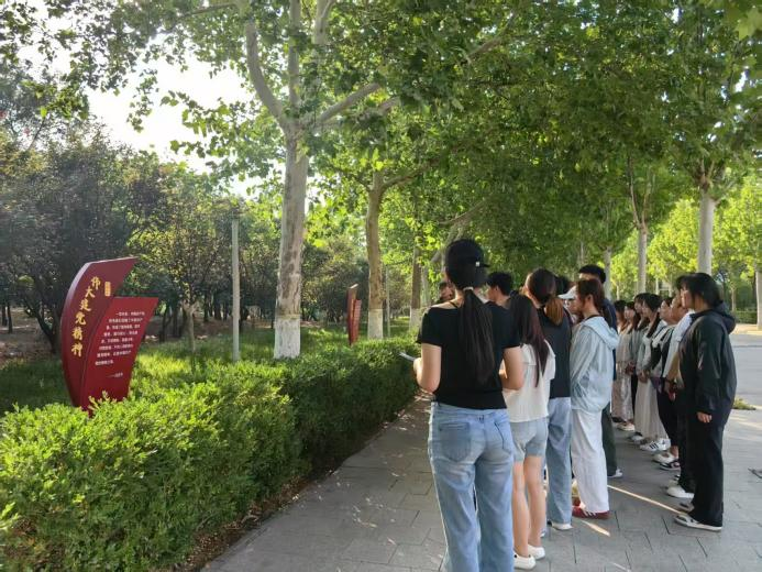 在校内环道绿树环绕间,同学们整齐列队,认真聆听党支部学生代表杨烁琪同学关于中国共产党人精神谱系的讲解。一旁矗立的“伟大建党精神”红色标牌上,详细阐释着“坚持真理、坚守理想,践行初心、担当使命,不怕牺牲、英勇斗争,对党忠诚、不负人民”的精神内涵。