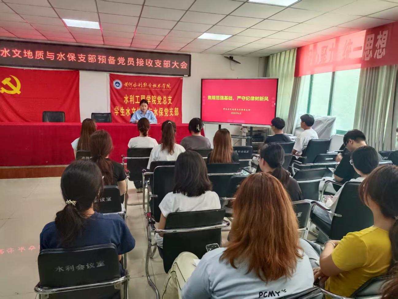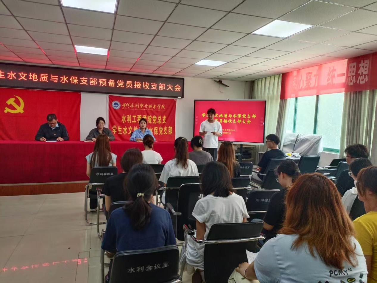 2025年6月9日上午,学生水文地质与水保党支部于实训3414会议室召开党员接收大会,专题审议程悦银等3名发展对象入党事宜。支部书记赵诗捷主持会议,全体党员、29名入党积极分子及3名发展对象参会。