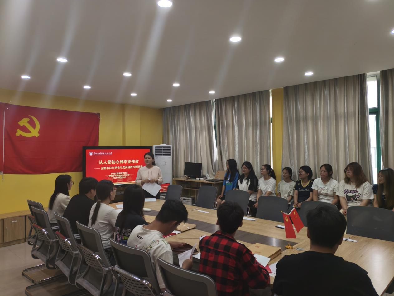 随后,全体党员在马君贤同志领誓下重温入党誓词,铿锵誓言彰显初心使命。支部为毕业生党员精心准备政治生日贺卡,传递组织关怀与期望。赵诗捷以《从入党初心到毕业使命》为题讲授专题党课,结合离校教育、党员纪律教育,强调毕业生党员要牢记身份、严守规矩,以实际行动践行入党誓词,在新征程中展现责任担当。