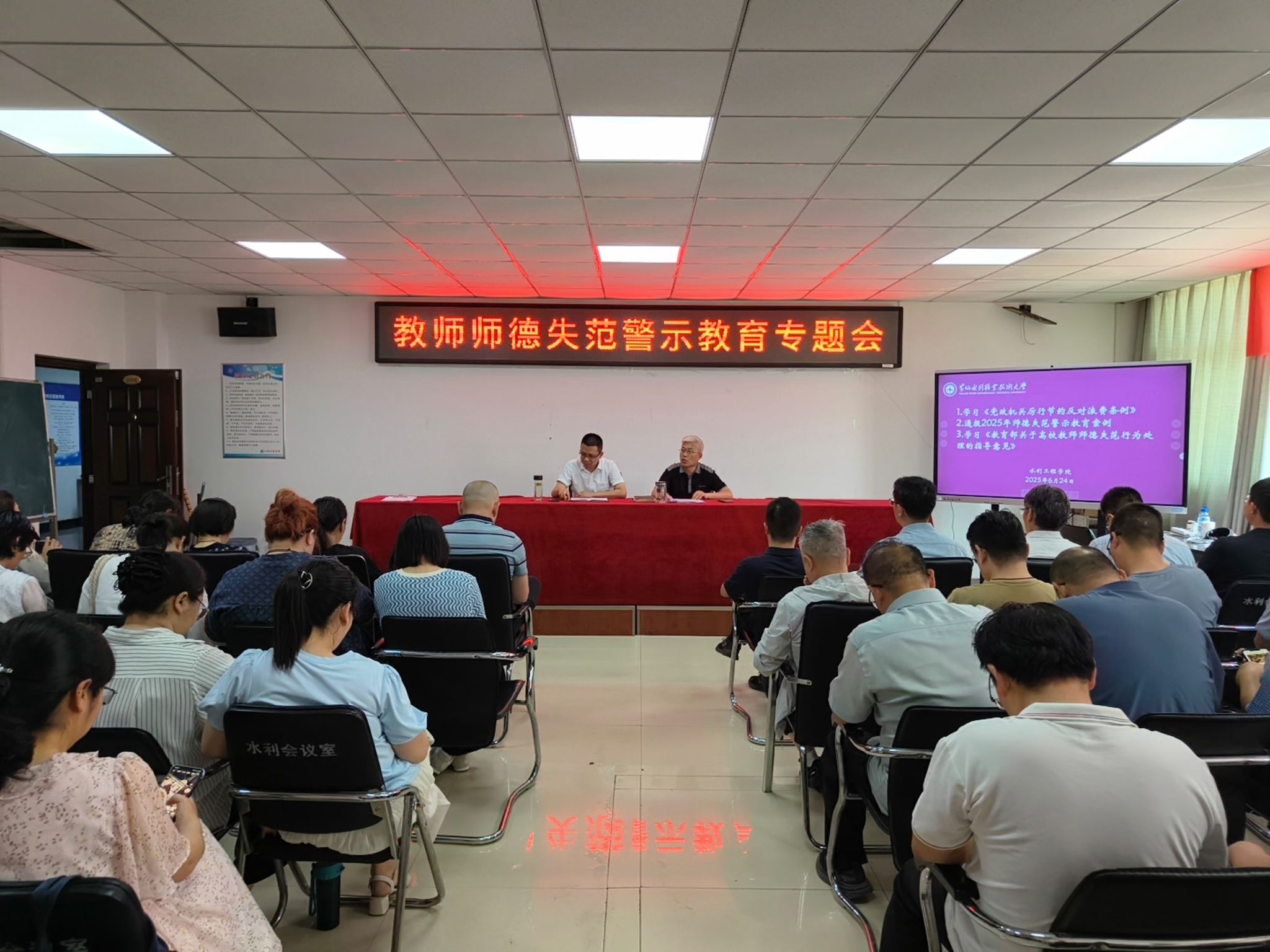 6月24日,水利工程学院在SX5310会议室召开教师师德失范警示教育专题会,院领导及全体教师参加会议,会议由院长雷恒主持,党总支书记王建设领学并讲话。
