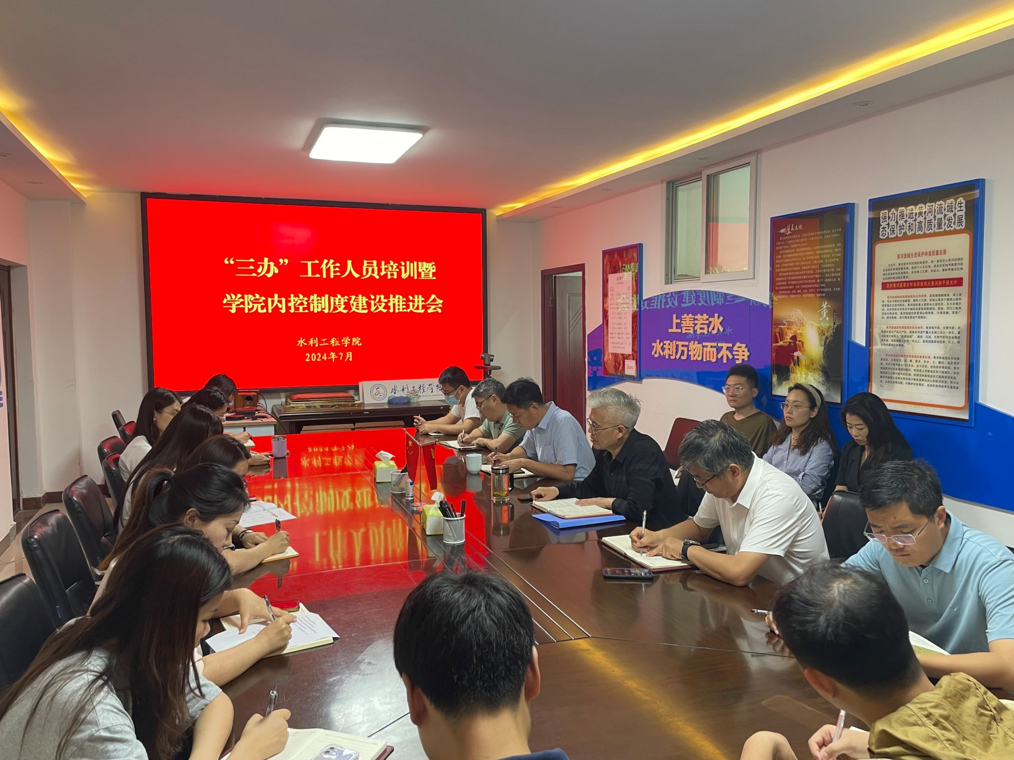 7月1日上午,水利工程学院召开“三办”工作人员培训暨学院内控制度建设推进会。学院党总支书记王建设作“办公室工作人员的角色定位与素质要求”专题培训,院领导班子、三办负责人及全体工作人员参加。