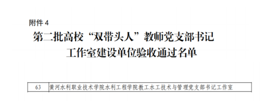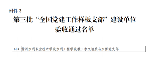 近日,教育部思想政治工作司公布了第三批新时代高校党建示范创建和质量创优工作和第二批高校“双带头人”教师党支部书记工作室建设单位验收结果,水利工程学院教工水文地质与水保党支部和教工水工技术与管理党支部书记工作室顺利通过验收。
