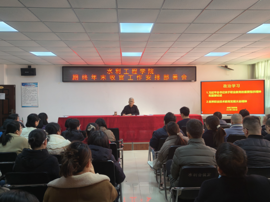 2024年12月3日下午,水利工程学院在实训5310会议室召开了期终年末收官工作安排部署会,会议由党总支书记王建设主持,学院全体教职工参加。