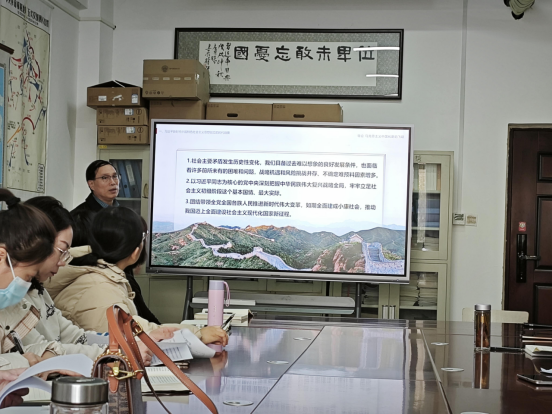 接着,主备课教师就《马克思主义中国化时代化新的飞跃》《新时代坚持和发展中国特色社会主义》两个专题进行说课。主备课教师准备充分、激情四溢,与会教师全神贯注、深入思考。随后,与会教师围绕教学过程中涉及的具体问题进行深入探讨,并提出各自意见和建议。
