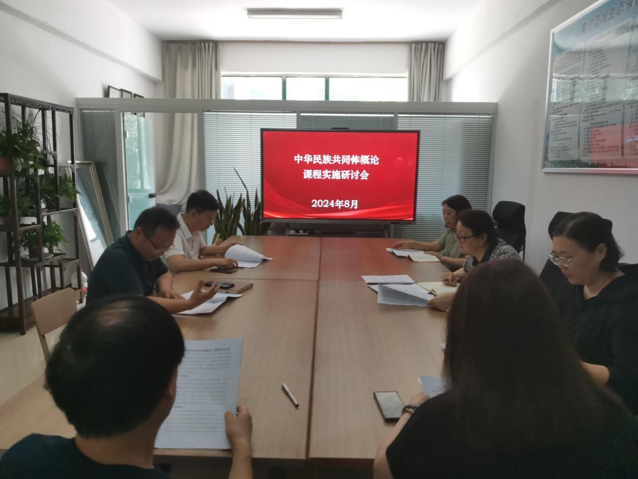 为深入学习贯彻习近平总书记关于加强和改进民族工作的重要思想,扎实推进我校铸牢中华民族共同体意识教育工作,8月13日上午,我院在会议室召开《中华民族共同体概论》课程实施研讨会。会议由马克思主义学院院长焦红强主持,马院领导班子成员、教研室主任参加。