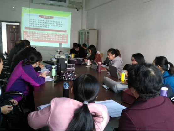 按照学校党委部署,思政部在岗全体教师于11月8日下午,就“十九大精神进课堂”进行集体备课,学习十九大精神,统一思想认识,让“新时代中国特色社会主义思想”等十九大报告中的40个新提法新举措,第一时间“带着热气”进入教案、进入思政课堂,武装广大青年学子的头脑。