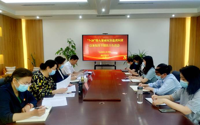5月26日下午,马克思主义学院在党建活动室召开“7·20”特大暴雨灾害追责问责以案促改专题民主生活会。学校党委书记周保平全程参加并指导会议。马克思主义学院院长兼直属党支部书记焦红强、副院长白霞以及科级以上干部、支委会成员参加会议。会议由焦红强主持。