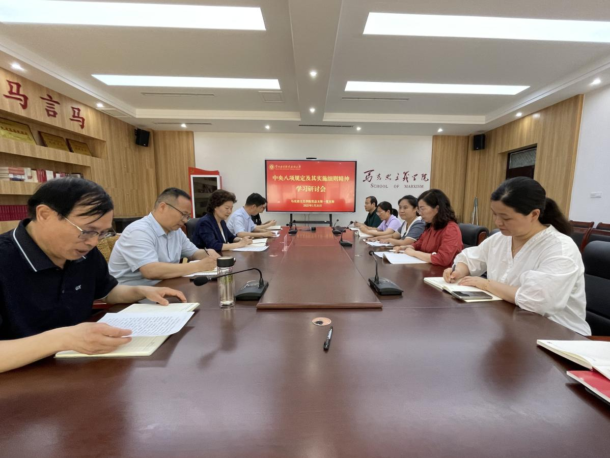 5月20日下午,马克思主义学院党总支第一党支部召开中央八项规定及其实施细则精神学习研讨会。会议由党支部书记孟卫兵主持。