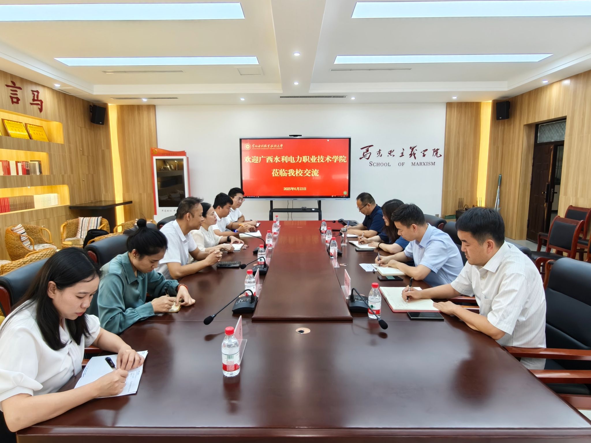 6月23日下午,广西水利电力职业技术学院电力工程学院党总支书记罗永强、马克思主义学院院长李春萌一行六人来我院进行考察交流,我校教务处处长陶永霞,电气工程学院党总支书记张延,马克思主义学院党总支书记杜丙辰、院长焦红强等与会座谈。