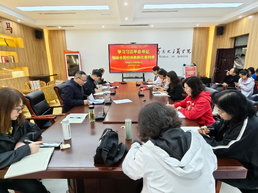 为持续深入学习贯彻习近平新时代中国特色社会主义思想,进一步贯彻落实习近平总书记关于教育的重要论述精神,10月14日,马克思主义学院组织教职工深入学习《习近平谈治国理政》第五卷和习近平总书记给全国特岗教师代表重要回信精神。通过学习,进一步增强了学院思政课教师对党的创新理论的政治认同、思想认同、理论认同、情感认同,引导全体教职工始终在思想上政治上行动上同以习近平同志为核心的党中央保持高度一致。