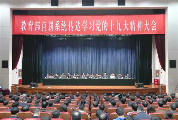 会议在教育部机关设主会场,各直属单位、直属高校设分会场。教育部党组成员、老部长、机关全体党员干部、直属单位班子成员、离退休干部党支部书记,各直属单位处级干部及党务工作者、工会干部、团干部,各直属高校班子成员及中层正职以上人员等近万人分别在主会场和分会场参加会议。据了解,此次会议也是教育部直属系统学习贯彻党的十九大精神干部集中轮训的开班式,大会报告是集中轮训的第一课。