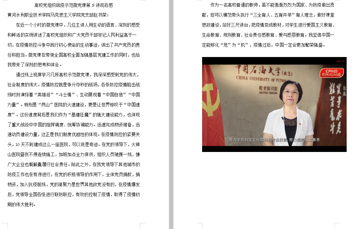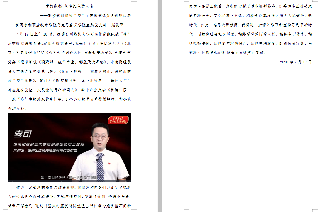 2020年7月17日,马克思主义学院直属党支部组织全体党员教师在线观看了《党旗飘扬 筑牢红色防火墙——高校党组织战“疫”示范微党课》第5讲,并动员他们就本次微课主题从思政教学维度谈谈自己的感想。