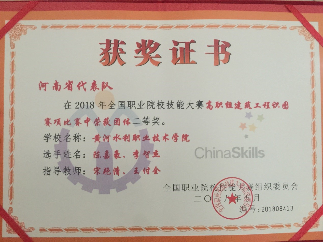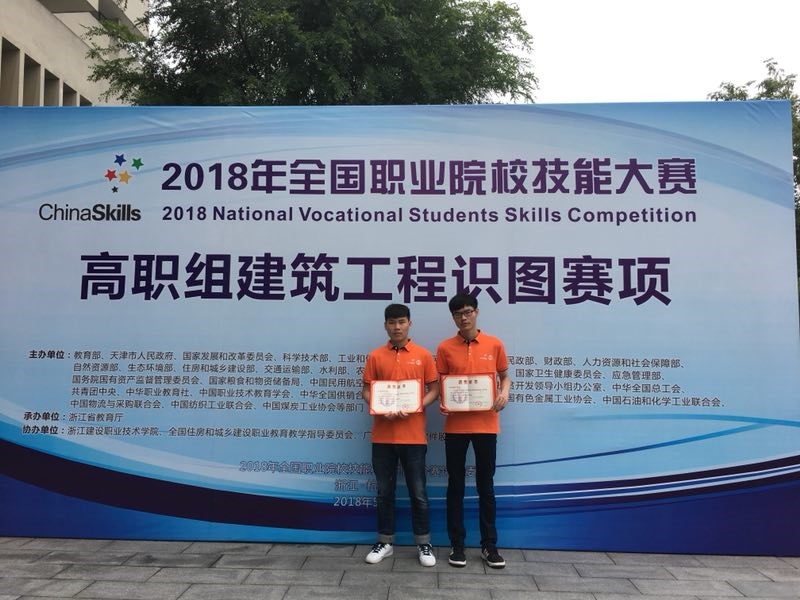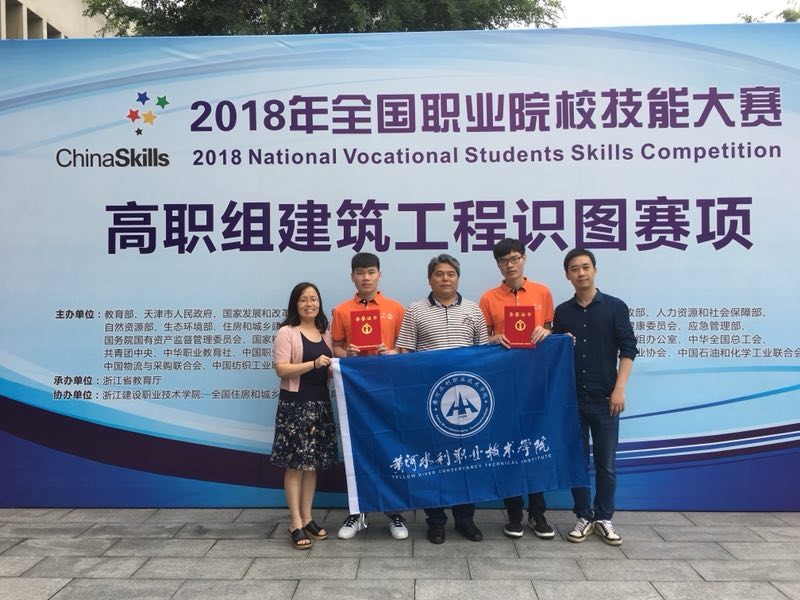 2018年5月26日,由教育部主办,浙江省教育厅承办,浙江建设职业技术学院、全国住房和城乡建设职业教育教学指导委员会协办的2018年全国职业院校技能大赛高职组建筑工程识图赛项在浙江建筑职业技术学院如期举行。此次大赛有30个省、市、自治区的104所职业院校共计208名选手参加比赛,共10所院校获得本届大赛的一等奖;21所院校获得二等奖;31所院校获得三等奖。由我校土木交通学院王付全、宋艳清、李向等教师指导的陈嘉豪、李智杰两位同学组成的黄河水院代表队取得团体第11名,荣获二等奖的佳绩。