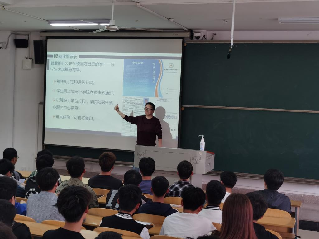 会上,朱老师介绍了我院2022届毕业生的相关数据,并结合学校下半年的就业工作安排有针对性的提出指导意见,希望同学们提前准备好简历材料,提前关注学校就业信息,规划好大三学年,同时加强了学生的就业诚信教育。