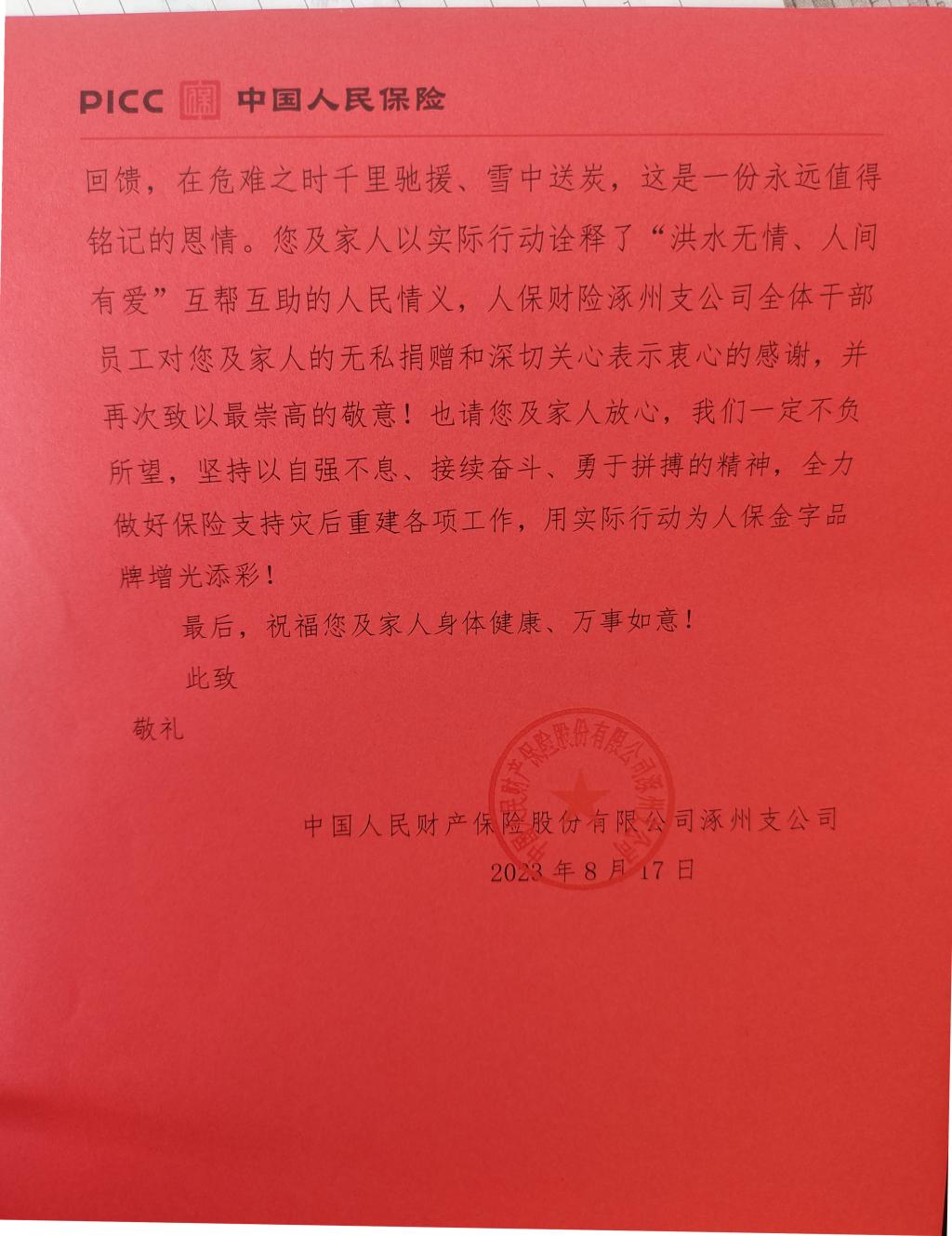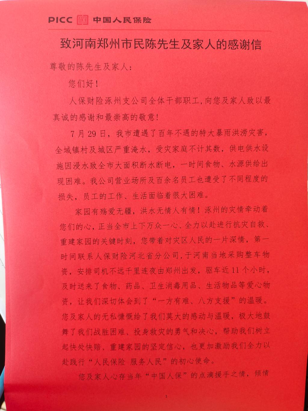 为什么要去两次?他说,作为曾被困水中几天几夜的亲历者,他对曾向自己伸出援手的河北人保充满感激。“在2021年郑州‘7.20’特大暴雨的时候,一个人被困在家里,断水断电,手机没信号,当时整个人是很绝望的,你不知道下一刻等待你的是什么。”就是在这种情况下,河北人保的救援电话竟然联系上了他。“他们询问我的身体状况,了解我的食物储备及人身安全,更难得的是他们告诉我信号断了之后还会不断联系我,让我一下子觉得有盼头了。”因为手机没信号,他无法与外界取得联系,接下来的几天,这个救援电话时不时打进来,让他觉得温暖不再孤单。“直到洪水退去,他们一直与我保持联系,并来到现场为我提供帮助。”正是2021年那场河北人保的救援,让陈佳在知道河北暴雨水灾后的第一个念头就是“我必须做点什么!”第一次是在旅游途中,事发突然,送的物资也是匆忙准备的,总觉得没有尽全力,心有遗憾,女儿的一句“那就再去一次呗”,让他开始了第二次行动!这不止是一个知恩图报的故事,也是一场大爱的传递和延续......