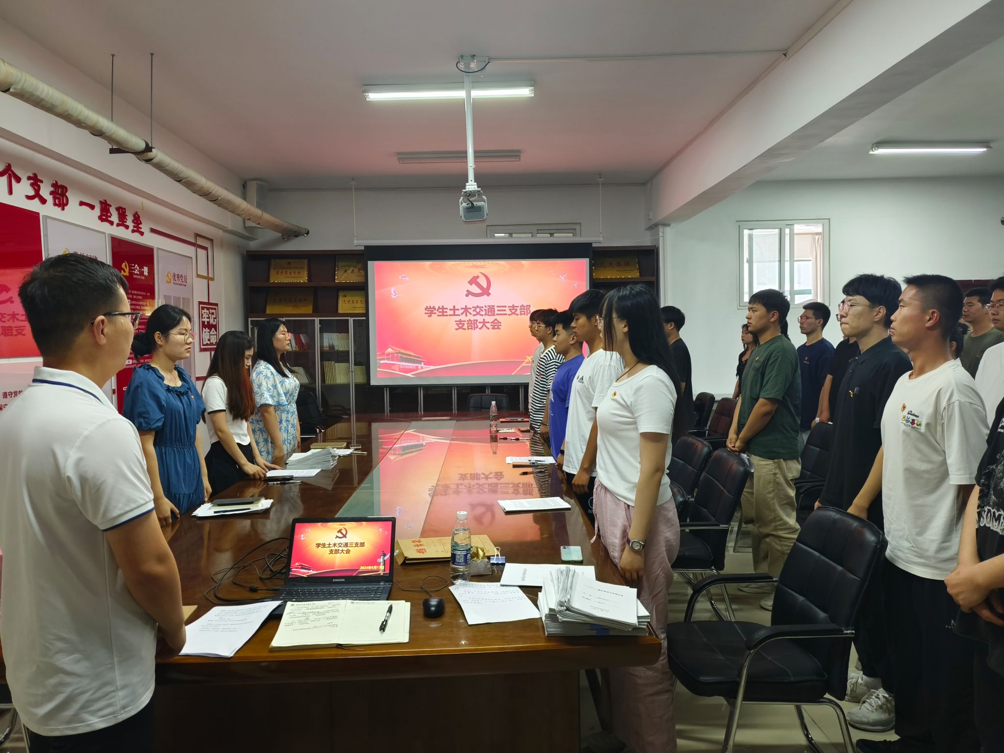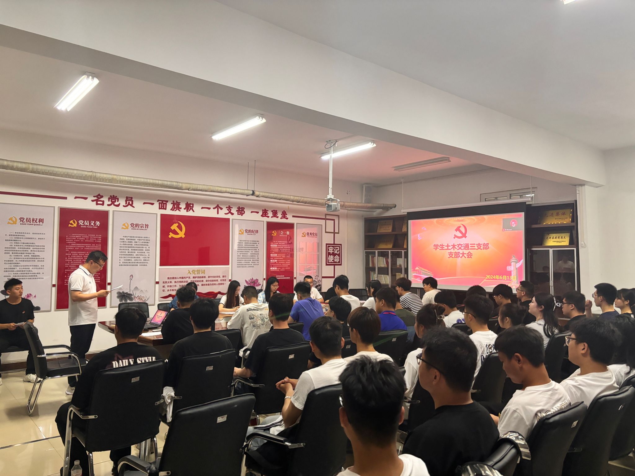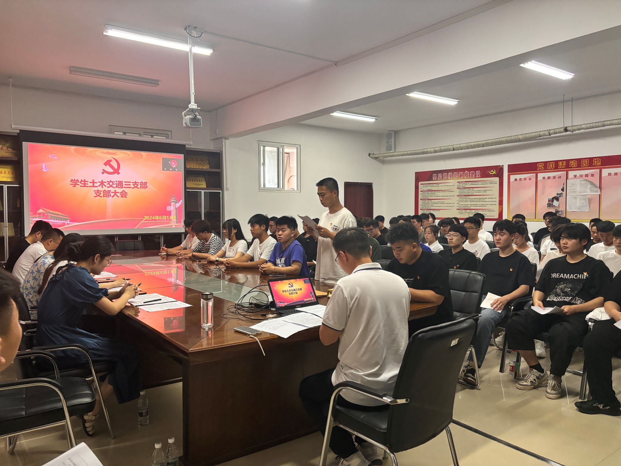 2024年6月13日上午九点,土木与交通工程学院第三学生党支部在SY5319举行了预备党员转正大会。本次会议由学生土木交通三支部组织员郭俊超主持,土木与交通工程学院党总支副书记孟宪金、商务与管理学院组织联络员肖星野、土木与交通工程学院党总支组织员兼学生土木交通三支部书记王嘉琪、宣传委员张艺博、教师党员王朦诗、9名正式学生党员及60名预备党员参会。会议主要讨论袁满等52名预备党员转正事宜。