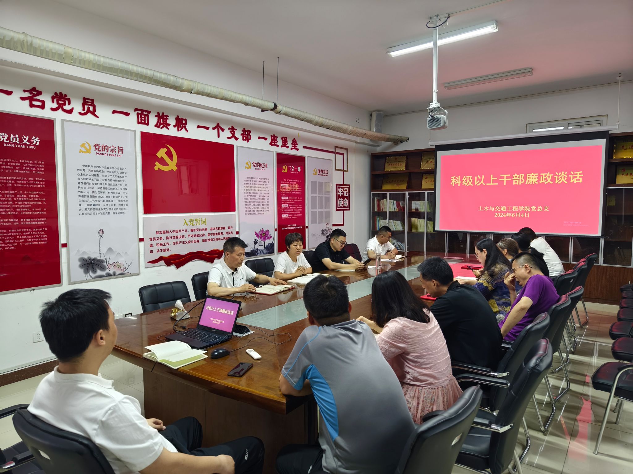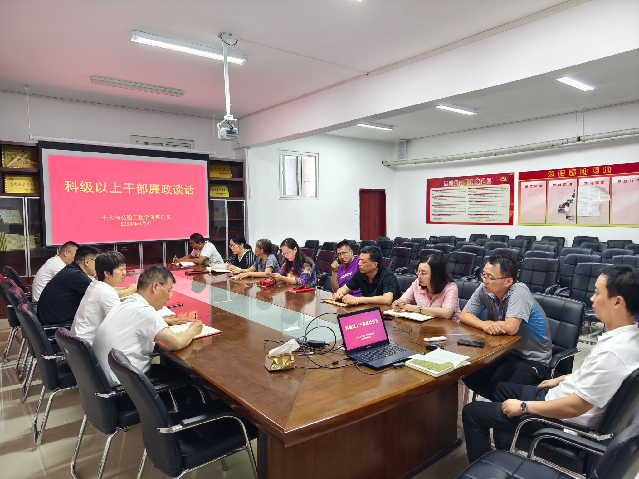 2024年6月5日,土木与交通工程学院在SY5319召开科级以上干部廉政集体谈话会议。会议由学院党总支书记耿亚杰主持,院领导班子成员、各教研室主任、各办公室负责人参加会议。