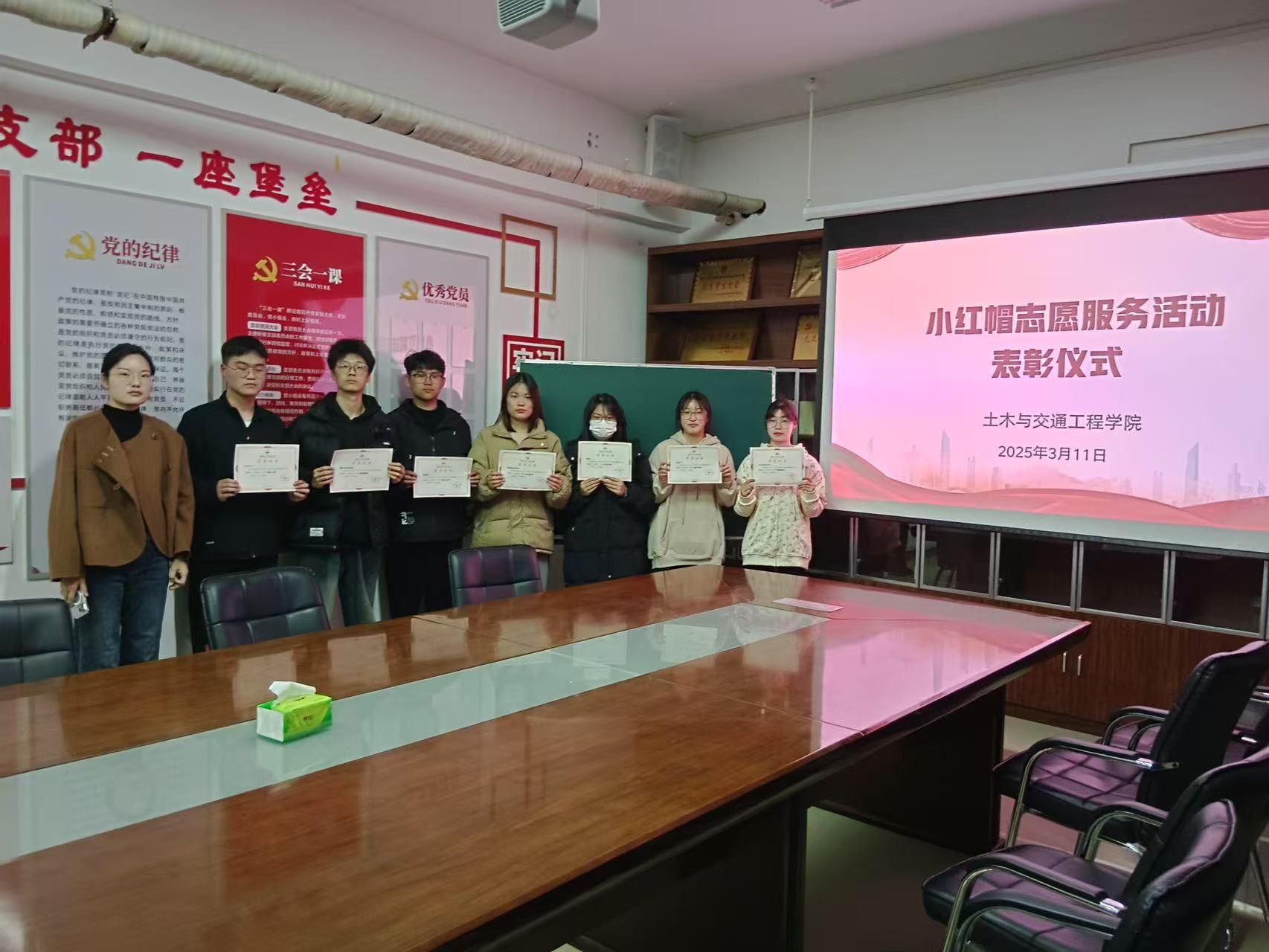 3月11日,土木与交通工程学院在实训楼5319会议室举行“小红帽”志愿服务表彰仪式,张艺博老师为5个“优秀班级”和6名“优秀工作者”颁发荣誉证书。