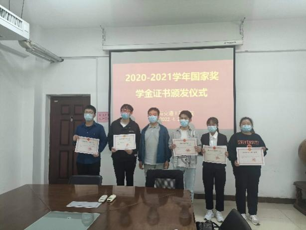 青衿之志,履践致远。为进一步推动学风建设,表彰先进、树立典型,土木与交通工程学院于2022年4月27日在SY5330举行了2020—2021学年国家奖学金证书颁发仪式。学院党总支副书记管欣、大二年级辅导员和2020-2021学年奖学金获得者杨宇豪、武新雪等5名同学参加会议,因疫情防控,王灵博等其余4名奖学金获得者及其他学生参加线上会议。