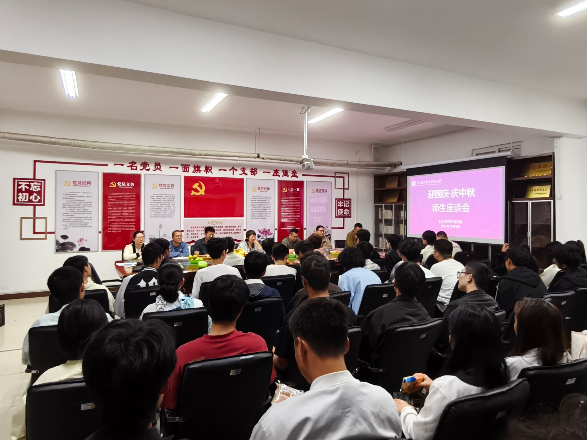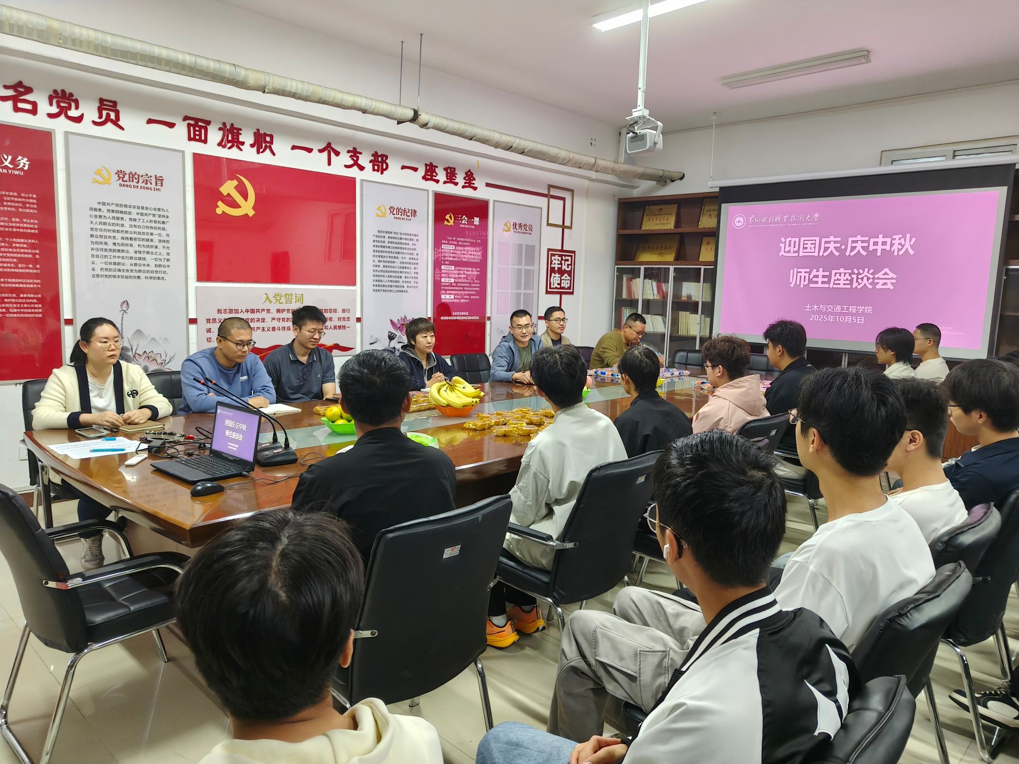 金秋送爽,丹桂飘香。在举国欢庆中华人民共和国成立76周年暨传统中秋佳节之际,为深化爱国主义教育,弘扬中华优秀传统文化,表达学院对留校学生的深切关怀,2025年10月5日上午,土木与交通工程学院在学院会议室隆重举办了“迎国庆·庆中秋”师生座谈会。学院领导、新生辅导员与近60名2025级留校新生欢聚一堂,共叙家国情怀,同庆双节。