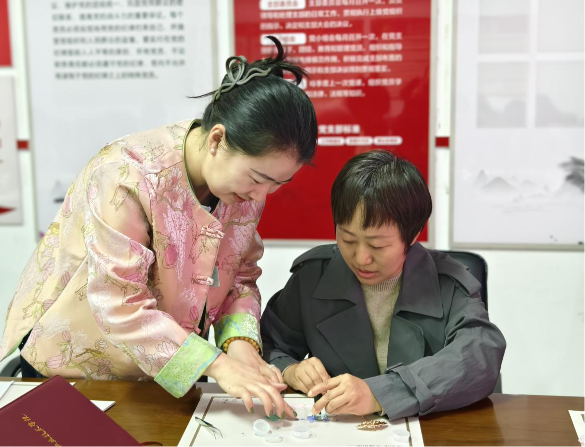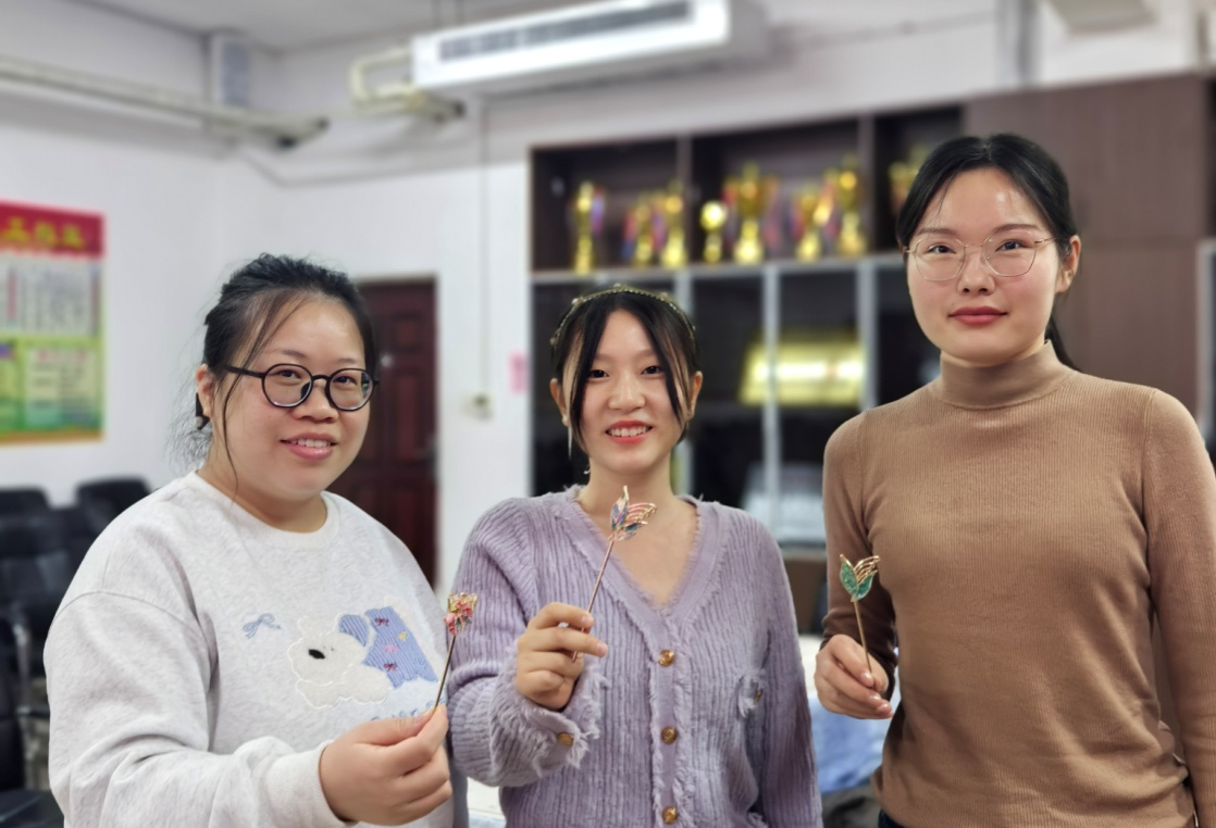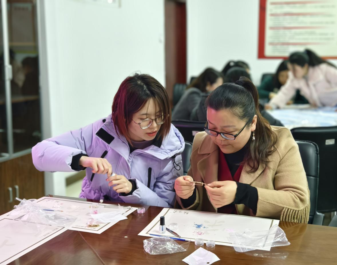 活动现场专业老师通过实物展示、操作演示等形式,带领女教职工们走进这门跨越千年的指尖艺术。在实践环节,女教职工们化身“非遗学徒”,以螺钿薄片为笔,以匠心为墨,亲手设计并制作专属的螺钿发簪与胸针。现场欢声笑语,一件件精巧的作品在女教职工手中诞生,既有古典雅韵,又融入了现代审美意趣。活动尾声,大家佩戴亲手制作的螺钿饰品合影留念,璀璨贝光映衬着自信笑容,展现出新时代知识女性的优雅与力量。