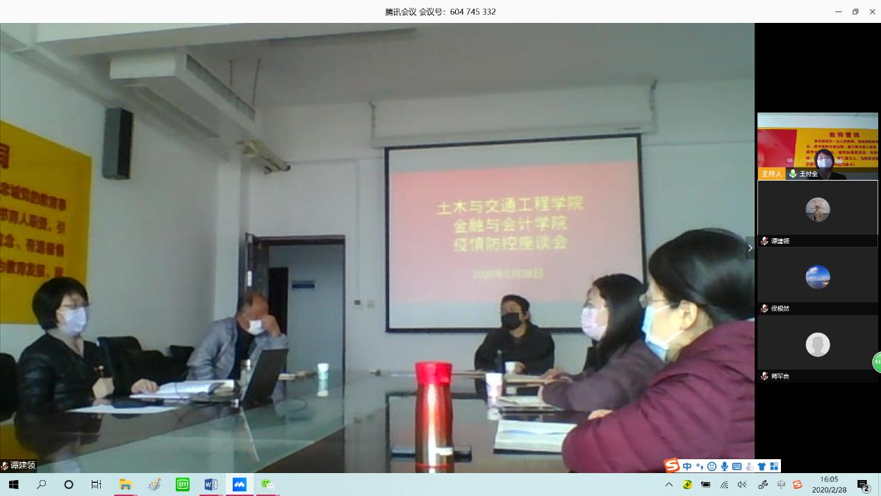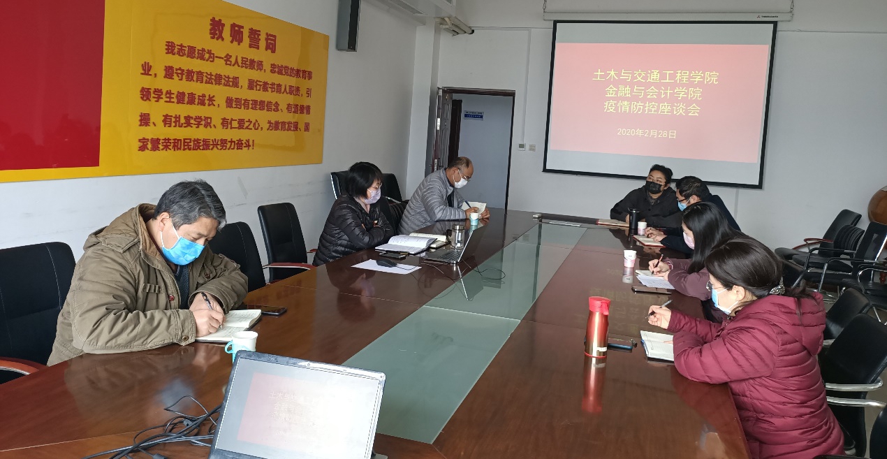 2月28日下午,校党委副书记、校长祝玉华在土木与交通工程学院会议室主持召开联系院部疫情防控工作会,传达河南省委高校工委关于疫情防控工作的视频会议精神,调研疫情防控工作。土木与交通工程学院、金融与会计学院的在校负责人参加了会议,未在开封的班子成员也通过视频会议模式听取了会议内容。