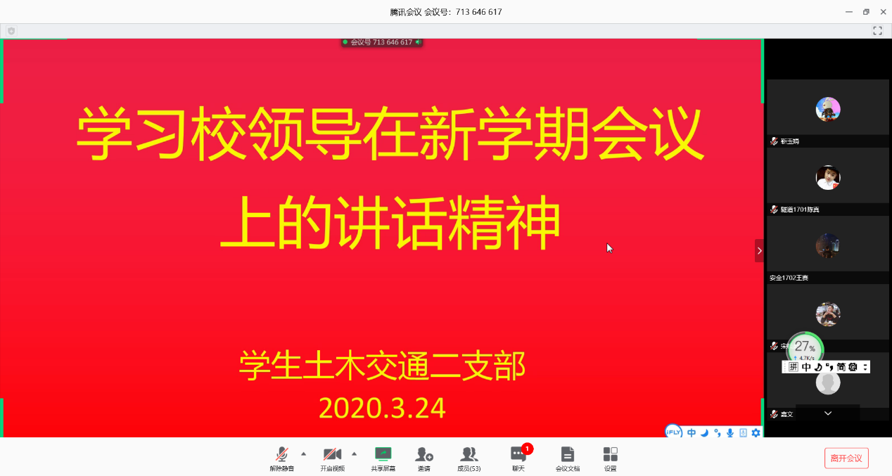 2020年3月24日,土木与交通工程学院学生土木交通二支部开展了在线政治理论学习活动,支部党员集体学习了学校领导在新学期工作会议上的讲话精神。校党委书记许琰简要分析了当前新冠肺炎疫情形势,解读了党中央、省委关于疫情防控的重大决策部署,讲述了战“疫”感人故事。许琰书记强调,疫情不解除,防控不松动,抓好开学前后的疫情防控工作必须遵守四个原则,即统筹谋划、统筹安排,统一指挥、统一行动,精准施策、精准发力,科学防控、联防联控。必须做到二个围绕,即围绕开学做好疫情防控工作,围绕恢复正常教学和生活秩序做好准备,一手抓疫情防控,一手抓事业发展。必须坚持三个导向,即坚持问题导向,补齐短板,科学管理,精准施策,立行立改;坚持过程导向,完善工作机制,压实工作责任,从严从细从实抓好网格化管理;坚持目标导向,坚决将病毒阻挡在校门之外,确保师生生命安全和身体健康。党委副书记、校长祝玉华代表校党委对2019年工作做了总结和回顾,对2020年党政工作进行了安排部署。祝玉华校长希望全体教职工坚定信心、奋发有为,以更高站位、更宽视野、更远眼光,只争朝夕,不负韶华,奋力谱写黄河水院砥砺发展的新篇章,为中原更加出彩作出新的更大贡献。