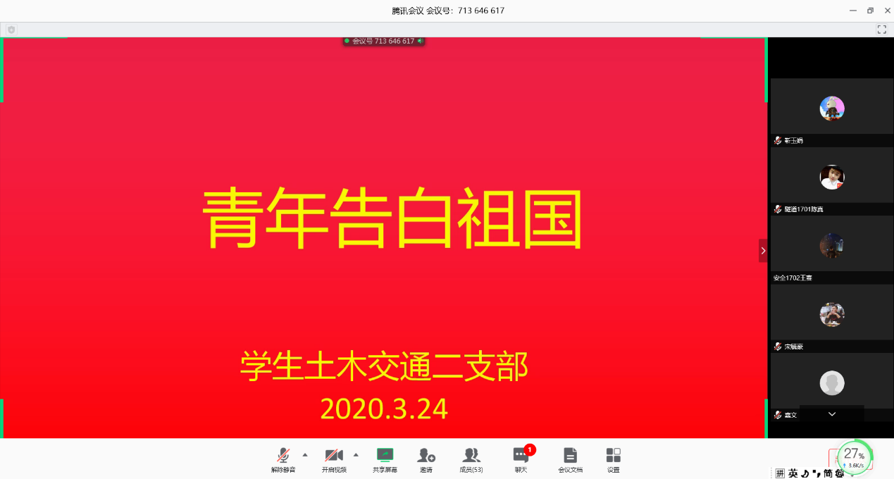 第二个环节是“青年告白祖国”主题党日活动的开展,活动倡议同学们写下自己的在疫情中的所见所闻所感所想,告白我们的白衣天使,告白坚守一线的工作人员,告白我们伟大的祖国。