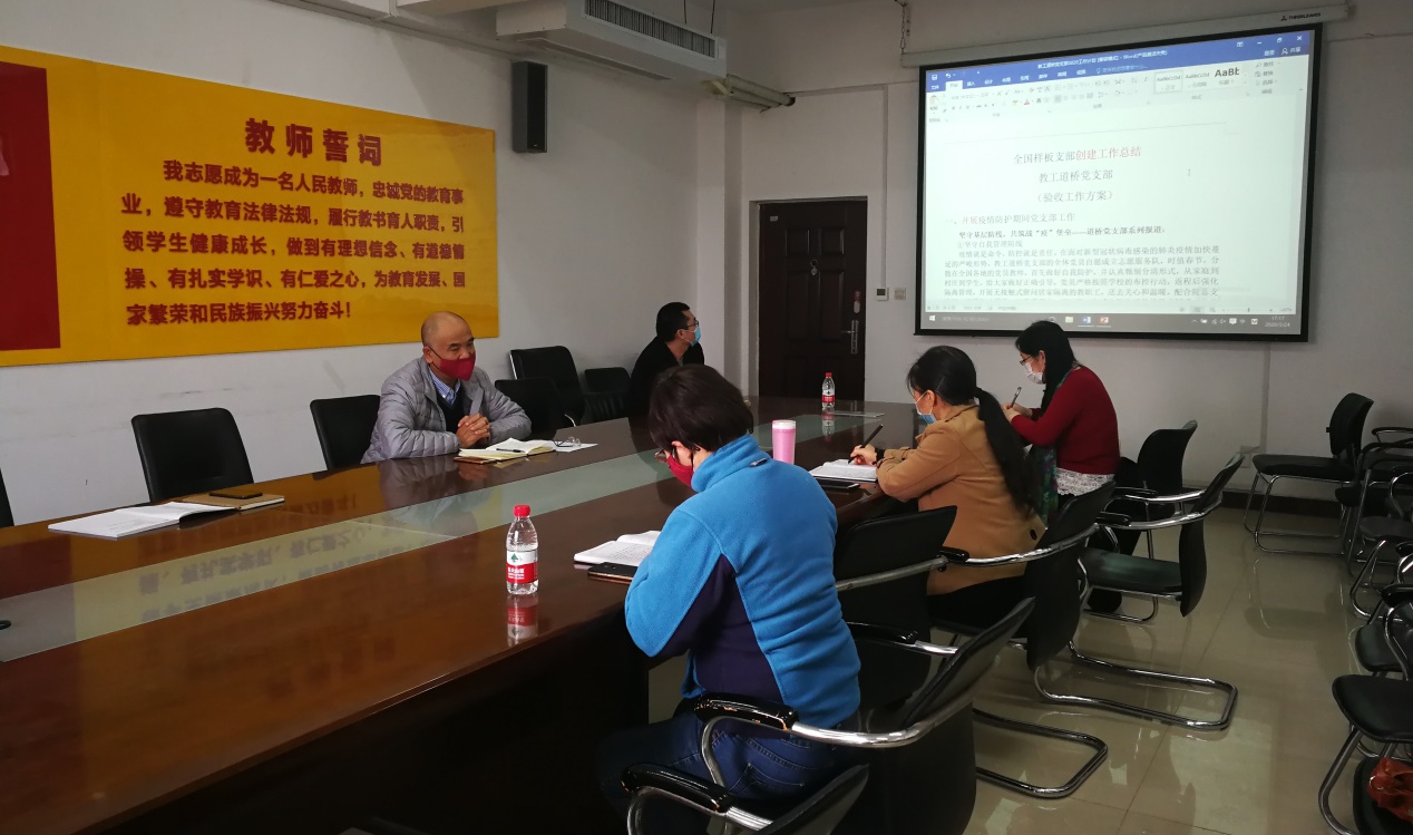 会上,教工道桥支部宣传委员贾春燕老师代表道桥党支部对2019年样板支部的创建工作、疫情防护期间党支部开展的工作、两年建设期的样板支部创建成果、建设经验等内容、做法、成效进行了系统的介绍。学院党总支书记赵杰对样板支部2019年创建工作成果予以肯定,并对2020年的党支部建设工作提出四点建议。一是在疫情防护特殊时期,要“把疫情当教材”穿插的到专业教学和党建工作中,对党员和学生进行引领教育;二是紧密围绕“七个有力”建设标准进行验收报告的总结;三是多方面多视角收集建设成果、凸显建设成效;四是提炼样板支部特色和亮点,为经验推广和辐射带动做好充分准备。
