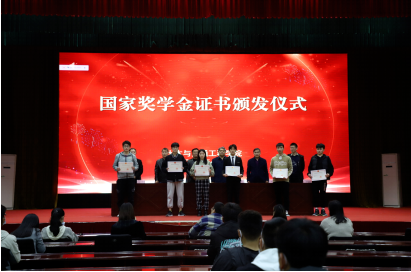 仪式上,院长王付全致开幕辞,并向获得国家奖学金的同学表示祝贺,激励同学们再接再厉、再创佳绩。随后,我院国家奖学金获得者代表王翰林上台发言,他分享了自己的大学生活和学习经验,表示感谢党和国家以及学校相关资助政策,勉励同学们积极进取,奋发向上。最后,6名国家奖学金获得者依次上台接受我院领导颁发的证书,并与领导合影留念。
