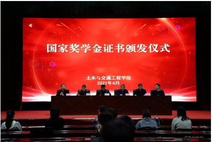 4月7日下午16:30,土木与交通工程学院在大学生活动中心举行2019-2020学年国家奖学金荣誉证书颁发仪式。土木与交通工程学院院长王付全,党总支副书记师军良,副院长侯根然、谭建领,院分团委书记朱一飞,分团委副书记牛贺洋以及各级辅导员出席本次仪式。