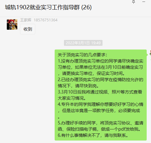 二、加强安全教育。2019级辅导员召开顶岗实习安全主题班会,教育学生做好顶岗实习期间的安全防范工作。同时,通过微信群、QQ群等方式转发我院《@2019级同学必看!顶岗实习安全注意事项》,提高学生岗位、人身、交通、财产等方面的安全知识。