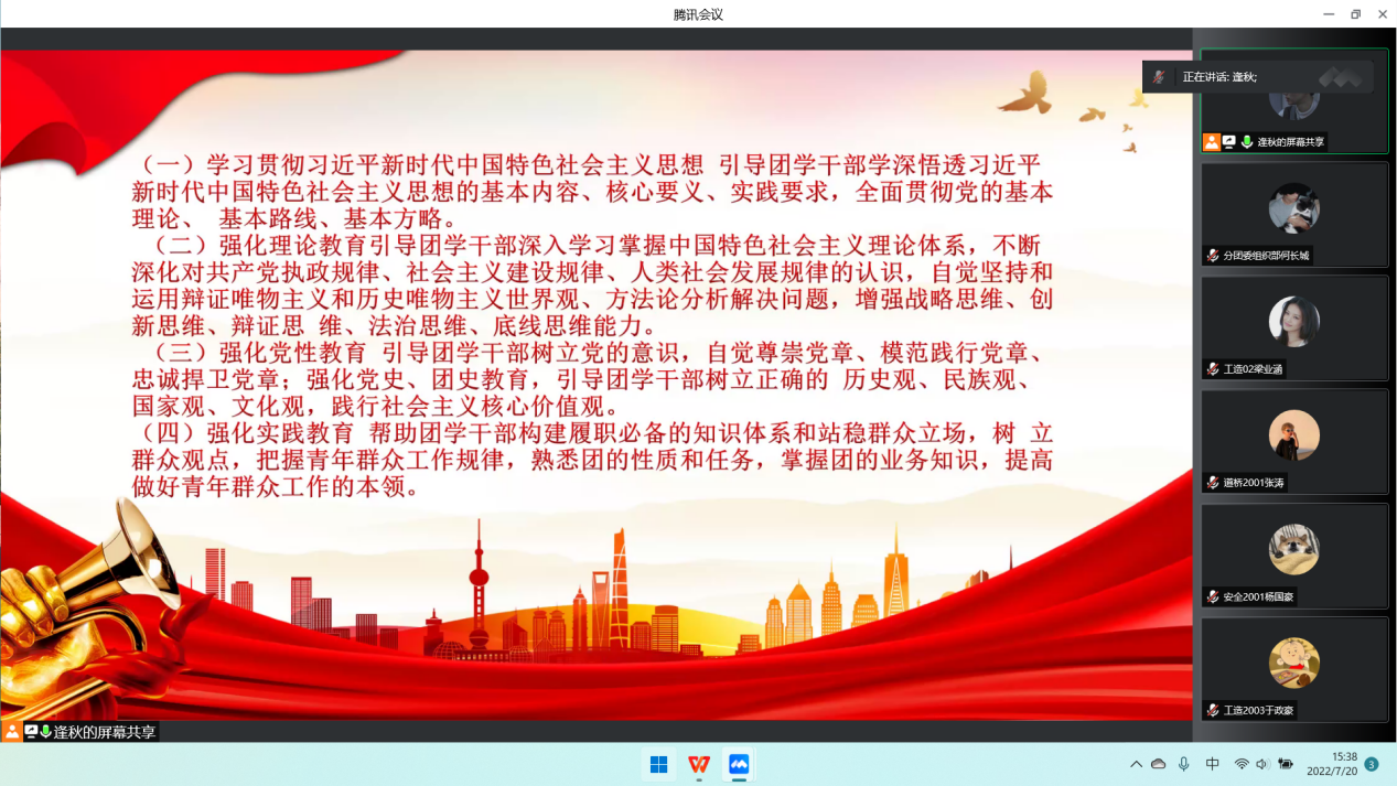 为加强我院团学干部的集体观念与服务意识,进一步提高自身素质,更好的为广大团员提供更优质的服务,我院于7月20日下午开展2022年度团学干部网络培训,各年级团支四干通过网络在线参加学习。
