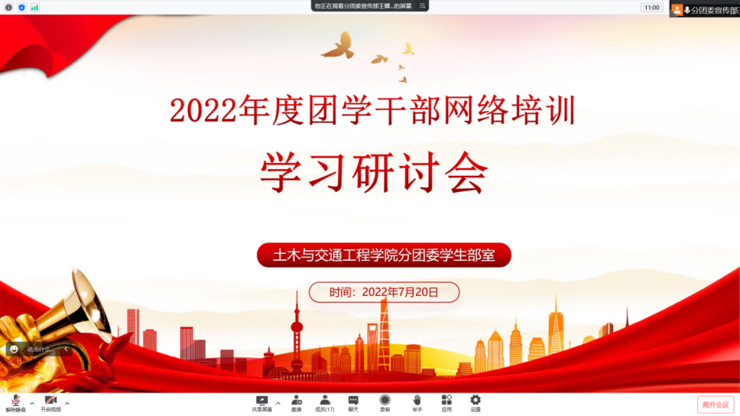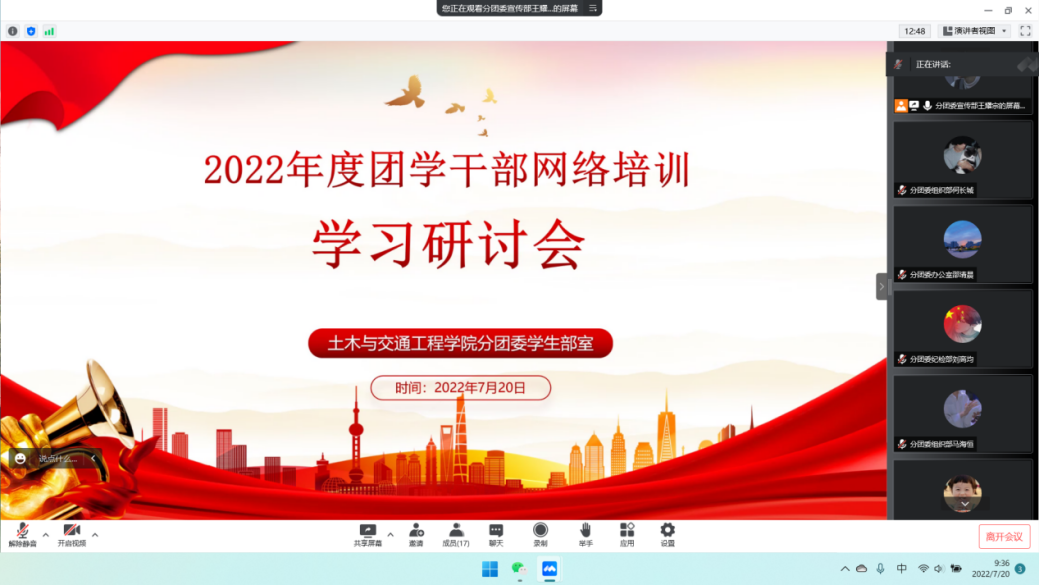 为加强团学干部的集体观念与服务意识,不断推进学生干部向内用功,进一步深化落实学党史、悟思想、办实事等工作要求,不断提升团学干部工作能力,土木与交通工程学院分团委开展2022年度团学干部网络培训,并于7月20日上午线上召开2022年度分团委学生会团学干部学习研讨会。土木与交通工程学院分团委学生会各部室团学干部参会。