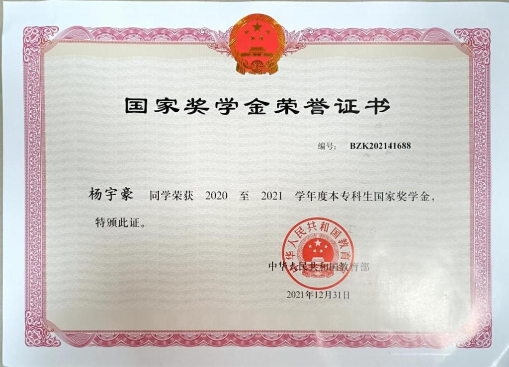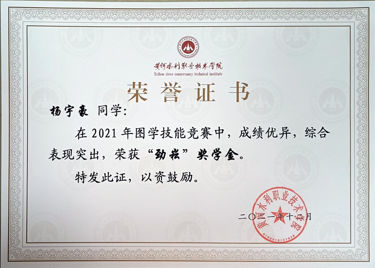 大一学年专业成绩第一名,获得“国家奖学金”,大二学年获得“国家励志奖学金”,同时还考取了BIM等级证书,1+X职业技能等级证书。
