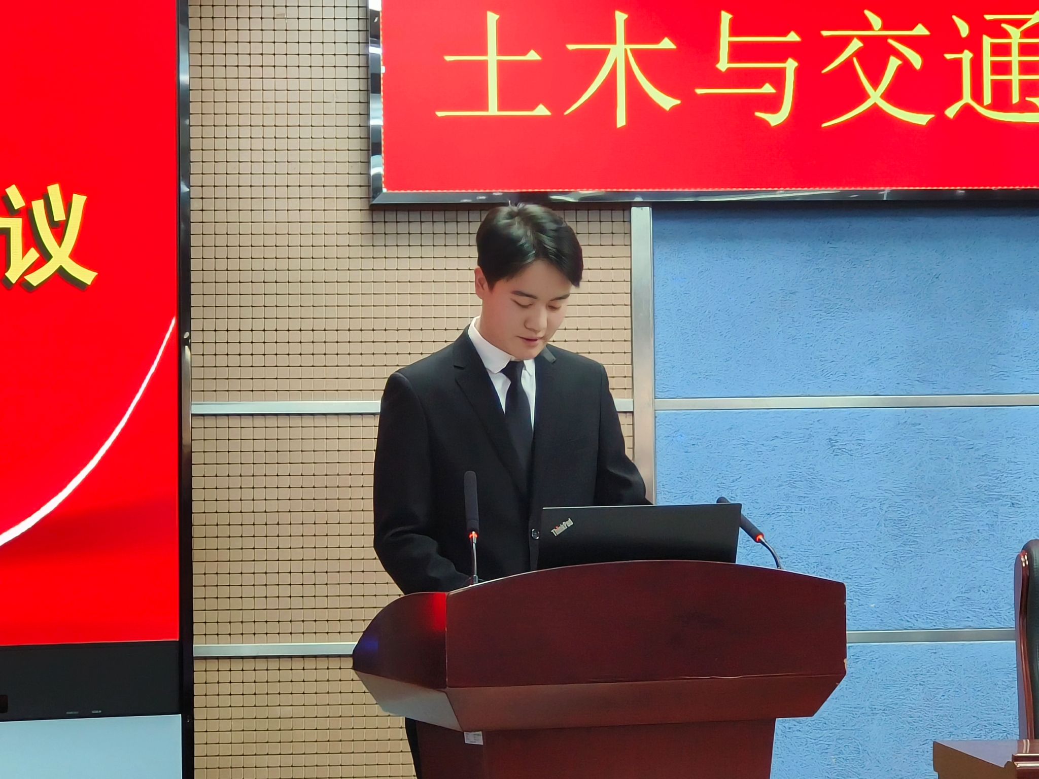 接着,校团委副书记姜璐代表校团委发表讲话,首先她对大会的召开表示热烈祝贺,并高度赞扬了我院学子在过去展现出的积极进取和无私奉献精神。她强调,校团委始终以服务、引领、凝聚青年为己任,将紧密配合学院中心工作,深化学生活动内涵,拓宽实践育人路径。同时,鼓励大家坚守初心,勇担使命,以饱满的热情投入学习与实践,为实现中国梦贡献青春力量。最后,她期望本次大会取得圆满成功,希望全体师生共同努力,开创土木与交通工程学院更加灿烂的明天。