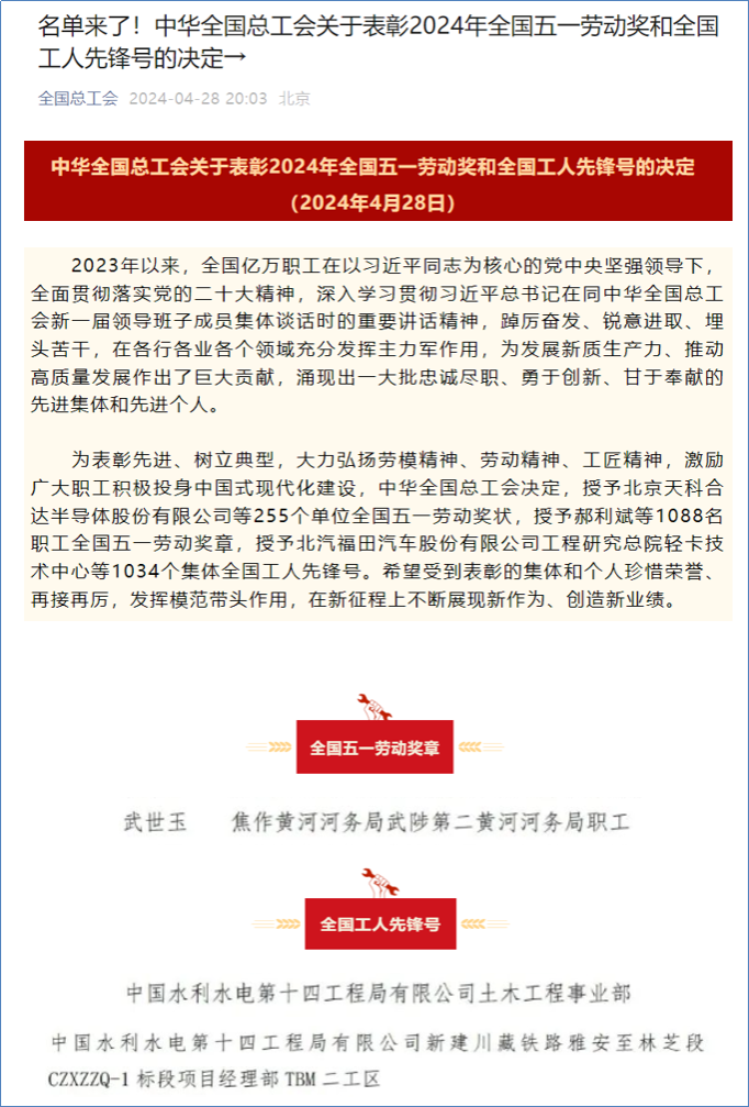 4月28日,中华全国总工会公布《关于表彰2024年全国五一劳动奖和全国工人先锋号的决定》,我校水利水电建筑工程专业2014届毕业生武世玉获全国五一劳动奖章,水利水电建筑工程专业2009届毕业生孙留阳任党委书记、总经理的中水十四局土木工程事业部、工程造价专业2009届毕业生倪耀文任副总经理兼总经济师的中水十四局轨道工程事业部所属新建川藏铁路雅安至林芝段某标段TBM二工区获全国工人先锋号。