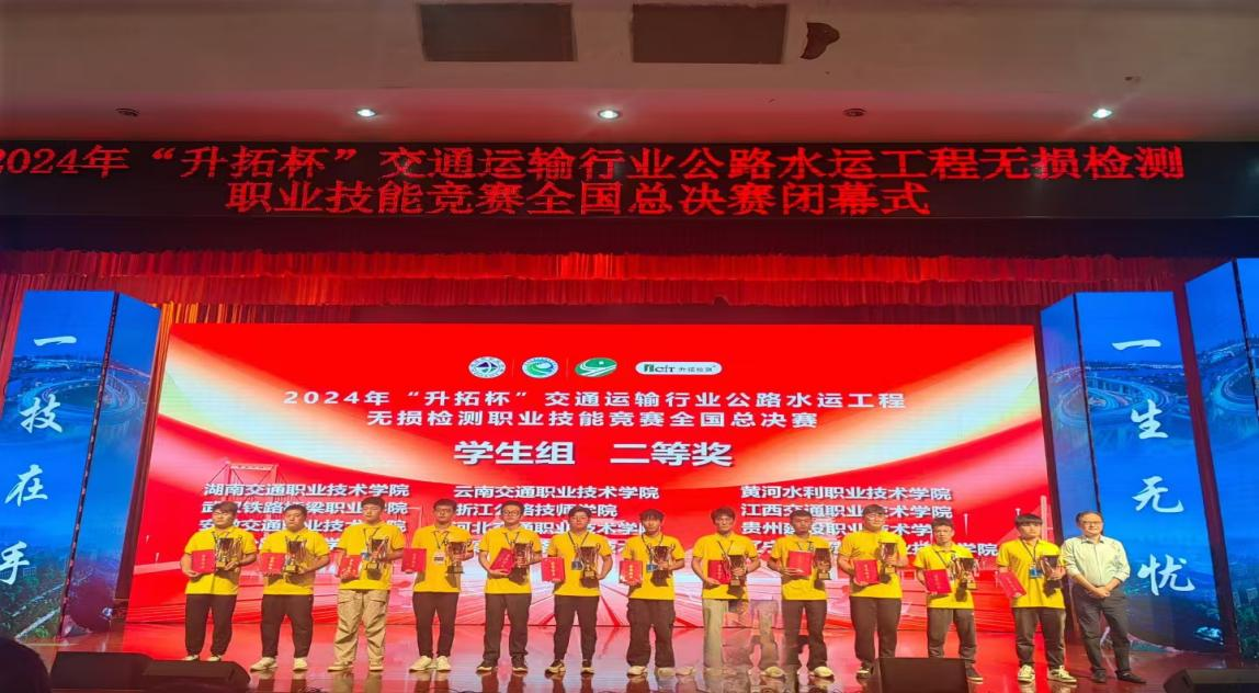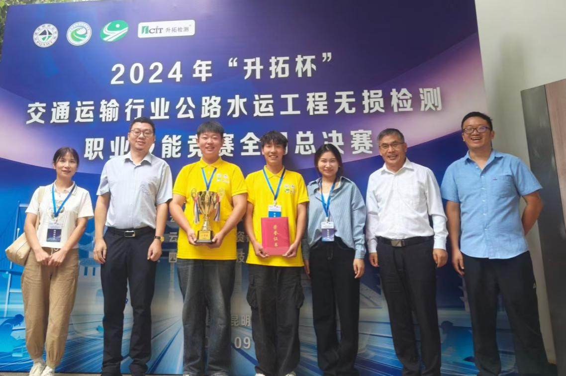 匠心铸就成才梦想,技能创造出彩人生。2024年9月20日至24日,2024年“升拓杯”交通运输行业公路水运工程无损检测职业技能竞赛全国总决赛在昆明成功举办。经过激烈角逐,由我院吕新娓、孟宪金老师指导,学生梁耀伟、张飒组成的参赛队伍荣获团体赛二等奖。此次大赛由交通运输部职业资格中心主办,由云南交通职业技术学院、云南省交通投资建设集团承办,四川升拓检测技术股份有限公司协办。大赛以“一技在手,一生无忧”为主题,旨在通过竞赛激发无损检测从业人员和同学们的学习技术、锻炼技能、贡献社会的热情,提升无损检测的水平,为交通基础设施建设提供坚实的技术支撑和人才保障。